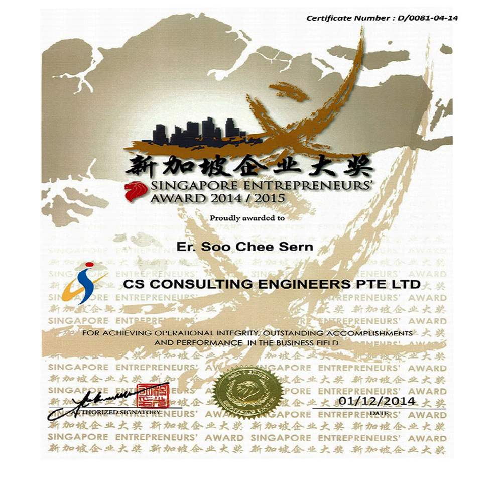 The Managing Director Er Soo Chee Sern / QP has been awarded SINGAPORE ENTREPRENEURS 2014/2015